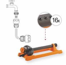 16-prúdový plastový výkyvný zavlažovač je lacným riešením na zavlažovanie záhrady, ak nechceme stavať automatický zavlažovací systém. 16 prúdov vody a vratný pohyb spôsobujú imitáciu dažďa, ktorý dodáva vodu do oblasti, ktorá má byť zavlažovaná. Dokáže zavlažovať naraz až 180 m2 (12×15 m) s takmer bezhlučnou prevádzkou. Je vybavený spojkovým konektorom, ku ktorému je možné pripojiť jedným ťahom ľubovolnú záhradnú hadicu s veľkosťou 1/2″ alebo 3/4″ rýchlospojkou. Zavlažovací oblúk je nastaviteľný medzi 20° a 100°. Poskytuje mimoriadne rovnomerné zavlažovanie pri prevádzkovom tlaku 2-4 bar. Pod spojkovým konektorom je filter, ktorý filtruje väčšinu nečistôt vo vode. Ak je zablokovaný len otvor, tak je zástrčka na konci plastovej tyče vybavená ihlou, ktorou sa dá ľahko vyčistiť.