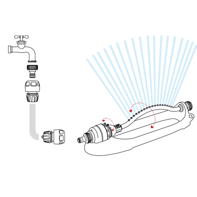 18-prúdový výkyvný zavlažovač je lacným riešením na zavlažovanie záhrady, ak nechceme stavať automatický zavlažovací systém. 18 prúdov vody a vratný pohyb spôsobujú imitáciu dažďa, ktorý dodáva vodu do oblasti, ktorá má byť zavlažovaná. Dokáže zavlažovať naraz až 220 m2 (13×17 m) s takmer bezhlučnou prevádzkou. Je vybavený spojkovým konektorom, ku ktorému je možné pripojiť jedným ťahom ľubovolnú záhradnú hadicu s veľkosťou 1/2″ alebo 3/4″ rýchlospojkou. Zavlažovací oblúk je nastaviteľný medzi 20° a 100°. Poskytuje mimoriadne rovnomerné zavlažovanie pri prevádzkovom tlaku 2-4 bar. Pod spojkovým konektorom je filter, ktorý filtruje väčšinu nečistôt vo vode. Ak je zablokovaný len otvor, tak je zástrčka na konci tyče vybavená ihlou, ktorou sa dá ľahko vyčistiť.