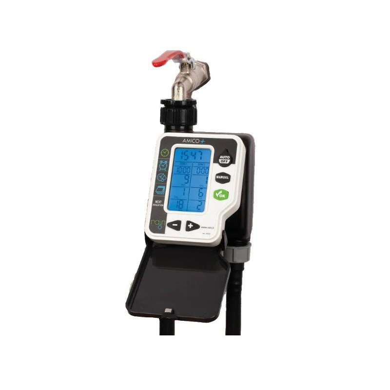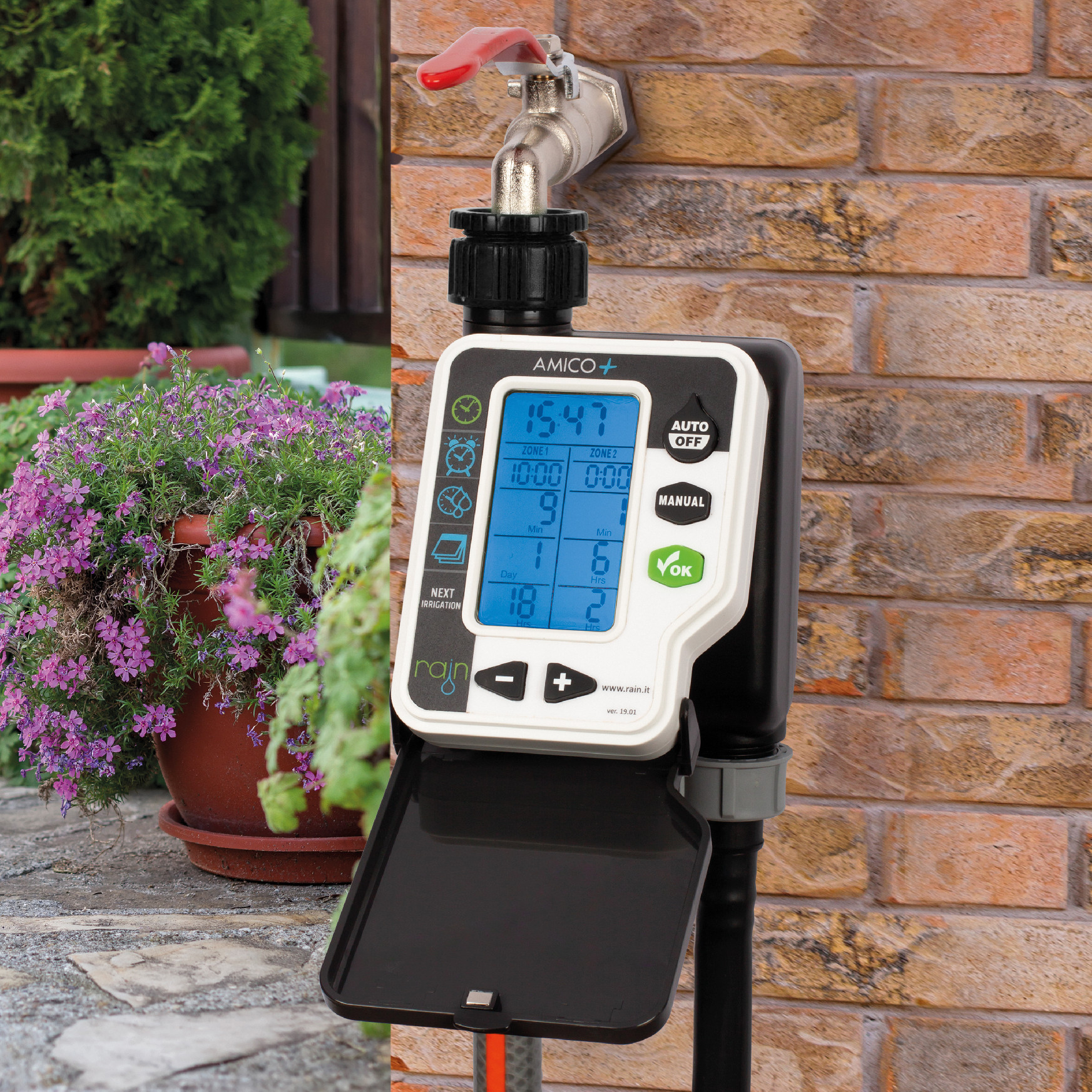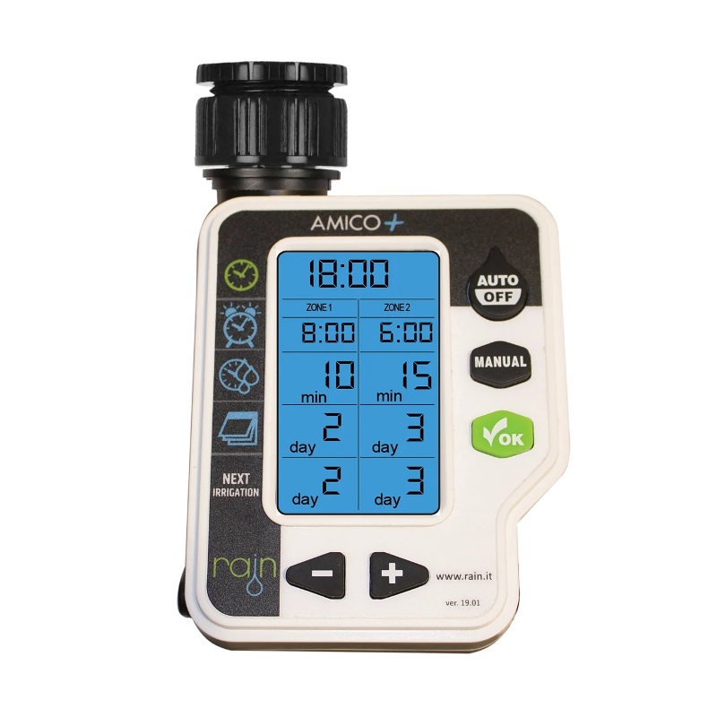 Rain Amico+ je ovládač napájaný z batérie pre domáce použitie. Je to vysoko spoľahlivý a dlhodobý produkt s vyváženým výkonom. Tento typ ovládača je k dispozícii v 1 alebo 2 zónových verziách. Vďaka 3/4″ alebo 1″ konektoru s filtrom a gumovým tesnením sa dá namontovať na väčšinu záhradných kolíkov. Jeho 3/4″ vývod s vonkajším závitom môže byť pripojený k záhradnej hadici s rýchloupínacím konektorom alebo dokonca k PE hadice alebo ku kvapkovej hadici. 2x 1,5 V AA batérie (nie sú súčasťou) zaručujú celosezónnu prevádzku. Ovládače Rain fungujú pomocu jednoduchého 3-krokového programovania: