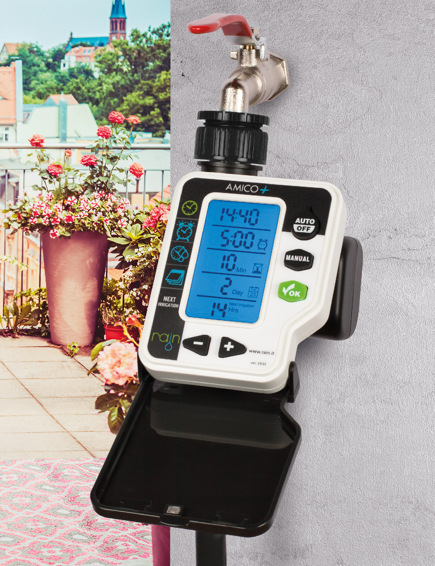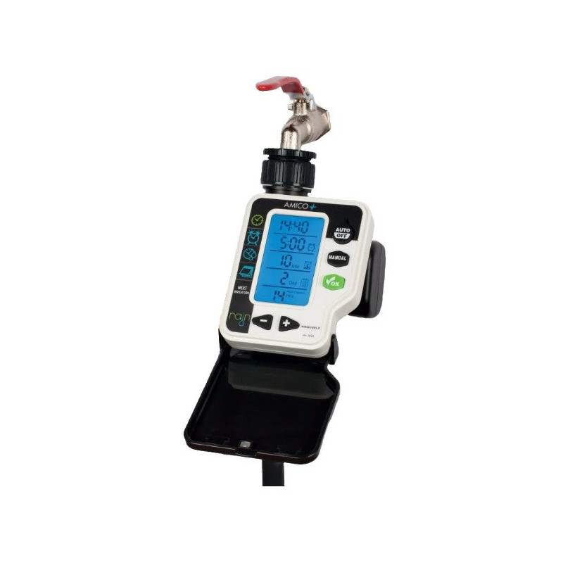 Rain Amico+ je ovládač napájaný z batérie pre domáce použitie. Je to vysoko spoľahlivý a dlhodobý produkt s vyváženým výkonom. Tento typ ovládača je k dispozícii v 1 alebo 2 zónových verziách. Vďaka 3/4″ alebo 1″ konektoru s filtrom a gumovým tesnením sa dá namontovať na väčšinu záhradných kolíkov. Jeho 3/4″ vývod s vonkajším závitom môže byť pripojený k záhradnej hadici s rýchloupínacím konektorom alebo dokonca k PE hadice alebo ku kvapkovej hadici. 2x 1,5 V AA batérie (nie sú súčasťou) zaručujú celosezónnu prevádzku. Ovládače Rain fungujú pomocu jednoduchého 3-krokového programovania: