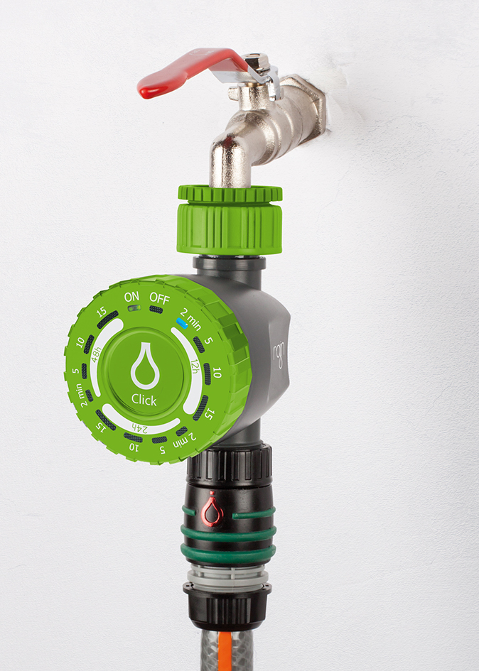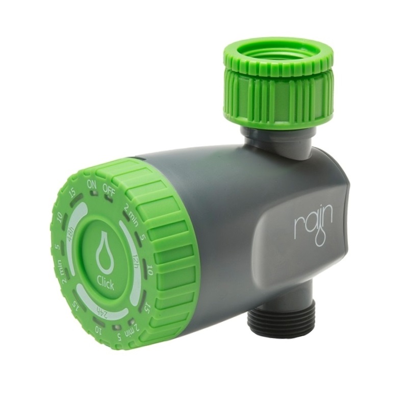 Rain Click je ovládač napájaný z batérie pre domáce použitie. Je to vysoko spoľahlivý a dlhodobý produkt s vyváženým výkonom. Tento typ ovládača je k dispozícii v 1-zónovej verzii. Vďaka 3/4″ alebo 1″ konektoru s filtrom a gumovým tesnením sa dá namontovať na väčšinu záhradných kolíkov. Jeho 3/4″ vývod s vonkajším závitom môže byť pripojený k záhradnej hadici s rýchloupínacím konektorom alebo dokonca k PE hadice alebo ku kvapkovej hadici. Vďaka veľmi jednoduchému a prehľadnému návodu môže každý ľahko pochopiť, ako nastaviť programy, spustiť alebo zastaviť zavlažovanie. 2x 1,5 V AAA batérie (nie sú súčasťou) zaručujú celosezónnu prevádzku. Zavlažovanie sa môže spustiť každých 12, 24 alebo 48 hodín s 2, 5, 10 alebo 15 minútovým chode pomocou ľahko ovládateľného otočného prepínača.