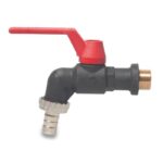Dvojvývodový ventil: Vonkajší závit 1/2″ s mosadzným nástenným pripojením, dva 3/4″ plastové výstupné pripojenia, z ktorých jedno je vybavené plastovou hadicovou koncovkou pre rýchle pripojenie.