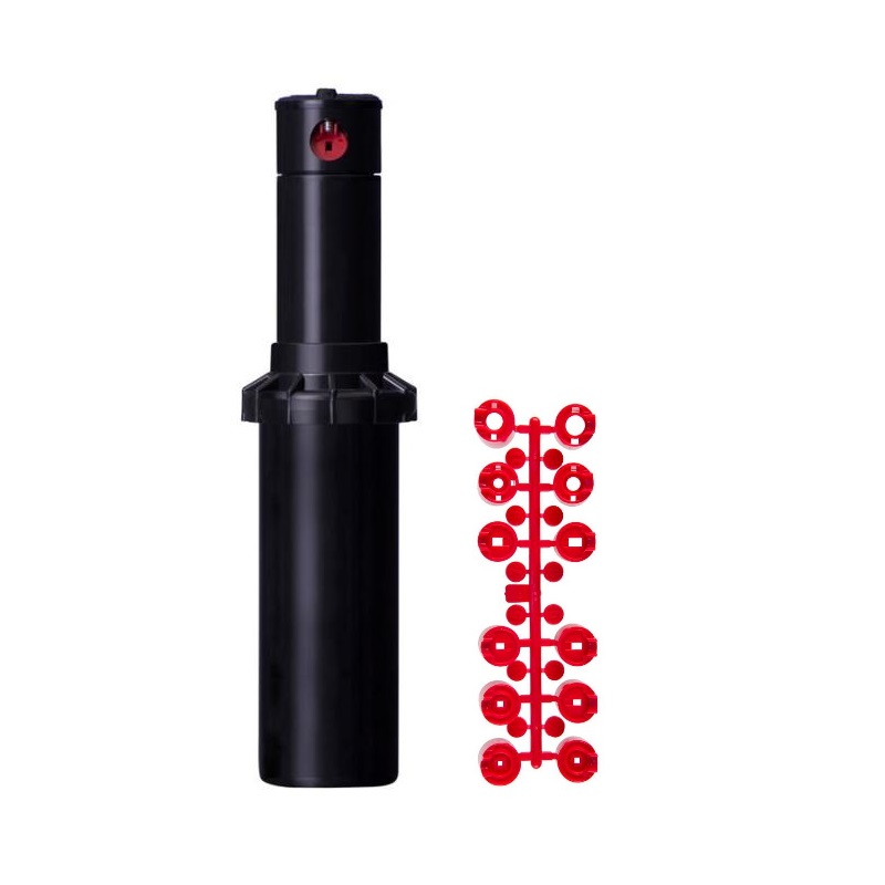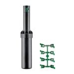 Rotačný postrekovač Hunter PGP-ADJ disponuje 10 cm-ovým výsuvníkom, ktorý je vybavený vnútorným 3/4″ pripojovacím závitom. Vďaka sade trysiek dokáže zavlažovať plochu 6,4-15,8 m.