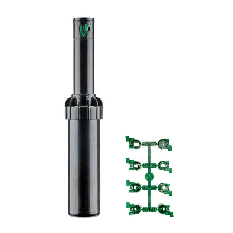 Rotačný postrekovač Hunter SRM-04 disponuje 10 cm-ovým výsuvníkom, ktorý je vybavený vnútorným 1/2″ pripojovacím závitom. Vďaka sade trysiek dokáže zavlažovať plochu 4,0-9,4 m.