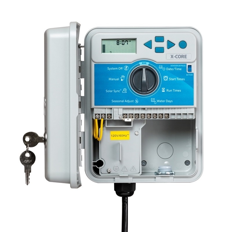 Ovládač môže byť pripojený k normálne zatvorenému dažďovému senzoru a môže tiež spustiť čerpadlo a hlavný ventil. Dažďový senzor je možné obísť pre každú zónu. Môže prevádzkovať naraz 3 elektroventily (1 hlavný ventil + 2 elektroventil na zónu). Je kompatibilný so senzorom Solar Sync, ktorý upravuje dobu zavlažovania bez zásahu človeka podľa ročného obdobia. Zásah Solar Sync je možné individuálne programovať alebo obísť. X-Core je vhodné na diaľkové ovládanie, čo umožňuje spustiť alebo zastaviť zavlažovanie v ktoromkoľvek bode zavlažovanej obdobia. Tento ovládač má 3 programy (A, B a C) so 4 časmi spustenia na jeden program, takže dá sa spustiť zónu celkom až 12-krát denne. Dni zavlažovania sú voľne voliteľné, nastaviteľné na ktorýkoľvek deň v týždni, zavlažované párnymi alebo nepárnymi dňami alebo cyklami až 31 dní. Čas behu každej zóny je možné nastaviť od 0 minút do 4 hodín v krokoch po 1 minúte. Môže byť naprogramovaný na oneskorenie nábehu (1-7 dní) a trvanie zavlažovania je možné nastaviť v 10% prírastkoch k sezóne (10% – 150%). Je možné nastaviť interval medzi spustením zavlažovacích zón, ktorý môže byť až 4 hodiny. Nastavený program sa dá uložiť, takže ak niekto zle nastaví ovládač, uložený program sa dá ľahko obnoviť.